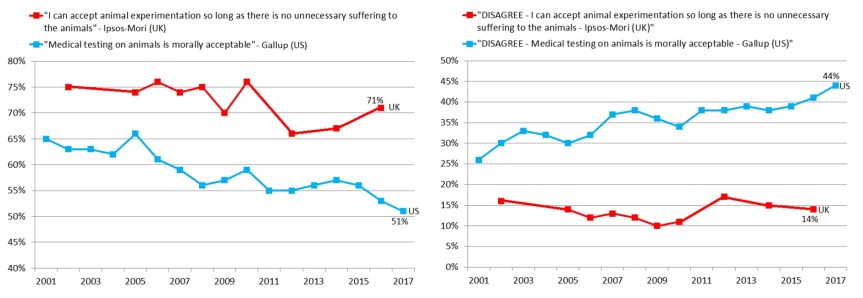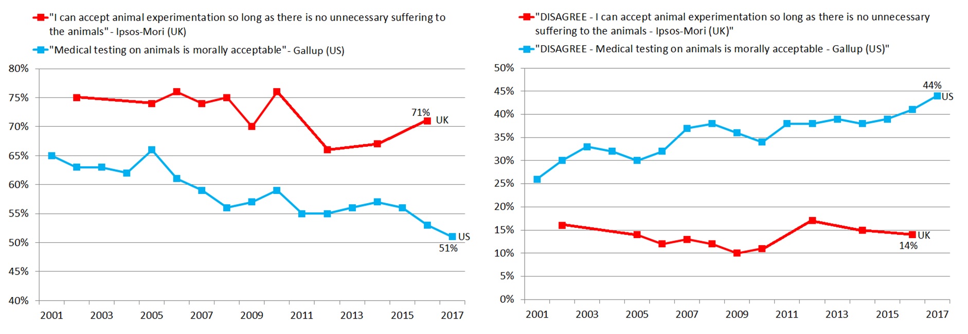 Tom Holder (Speaking of Research) spoke about the falling support for animal research in the US (see graphs below), as well as increasing opposition. He suggested that the Concordat on Openness on Animal Research in the UK may have contributed to the US avoiding the same trends in support and opposition. His talk revolved around why individual institutions benefitted from engaging in greater openness noting: the positive media publicity it can bring in; it can pre-empt many FOIA queries; it can build resilience and responsiveness within an institution; it helps engage with difficult journalists and media; and it helps prevent animal rights groups portraying animal research as secretive. Tom went on to note that improving the website information is an activity any institution can do to improve its openness on the issue.
