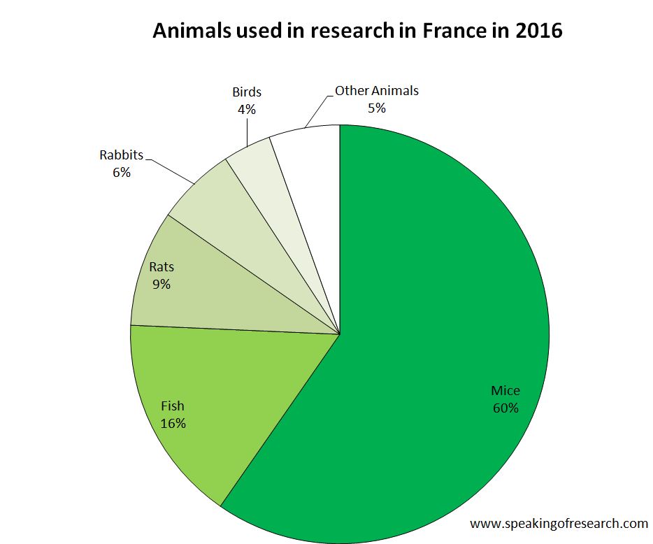 Mice, fish and rats account for 85% of animal studies in France. Unusually, rabbits are the fourth most used animal at 6% (though this is similar to neighbouring Belgium), followed by birds.