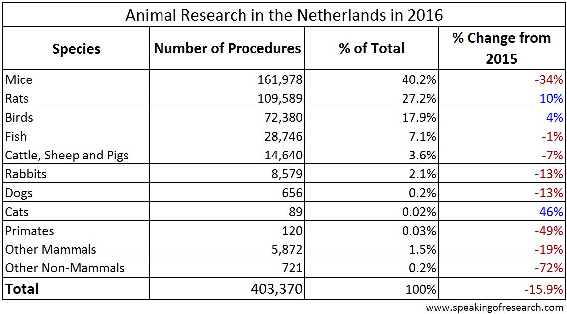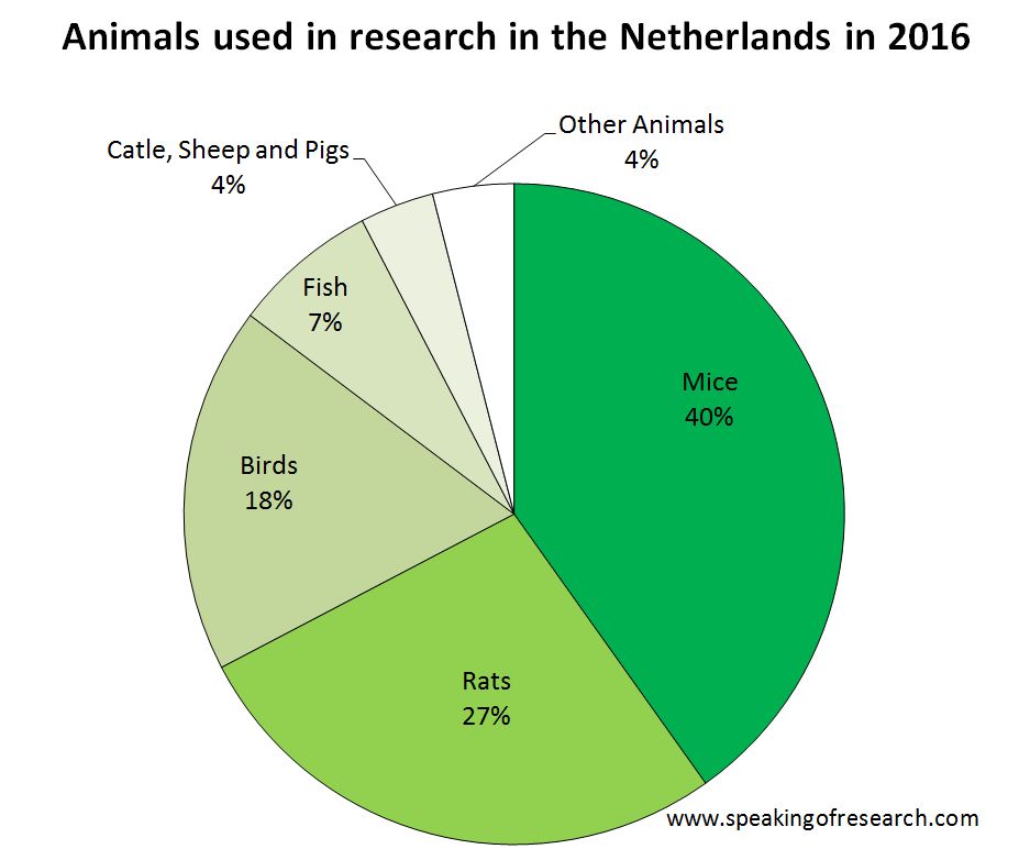 Mice, rats, birds and fish accounted for over 92% of animal studies in the Netherlands, about average in Europe.