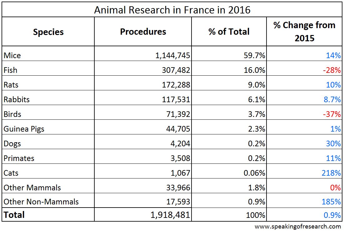 Until 2013, France released their animal research statistics on a triennial basis. Since 2014 and the implementation of EU Directive 2010/43, the French Ministry of Higher education, Research and Innovation began publishing animal use statistics on an annual basis. According to figures released this month (permanent link), France conducted 1,918,481 procedures on animals in 2016, a 0.9% rise on 2015.