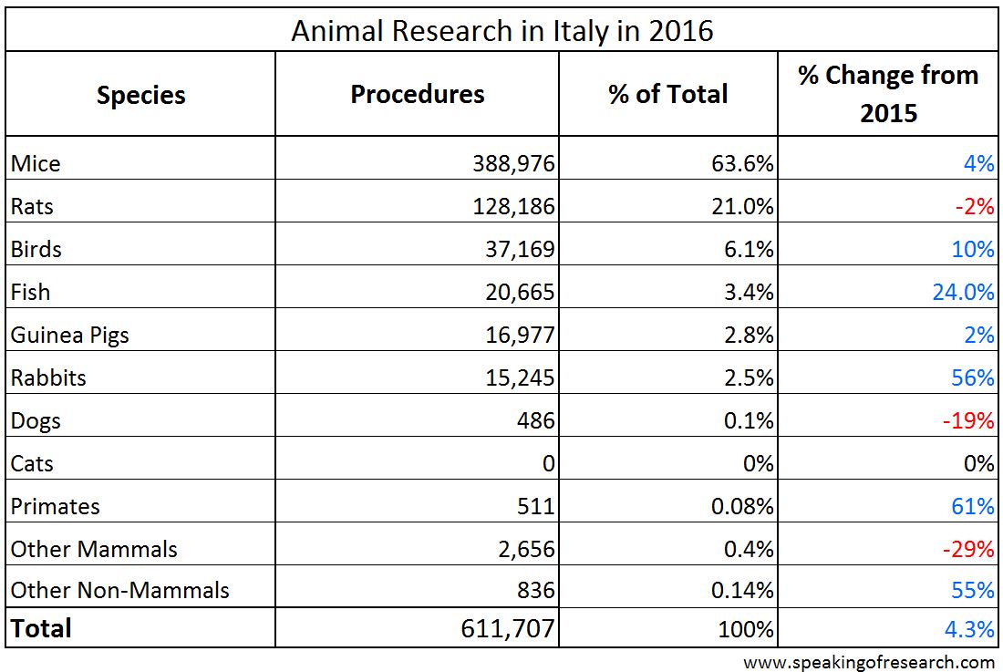 Mice, rats, birds and fish accounted for over 94% of animal studies in Italy, about average in Europe.