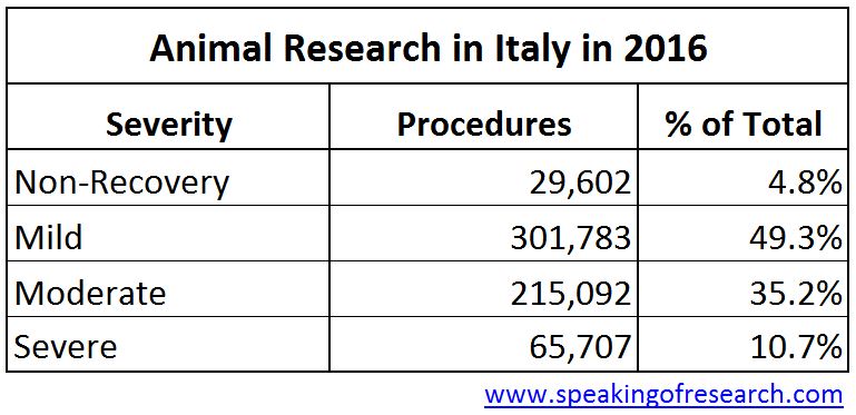 According to latest figures (permanent link), Italy conducted 611,707 procedures on animals in 2016, a 4.3% increase from 2015.