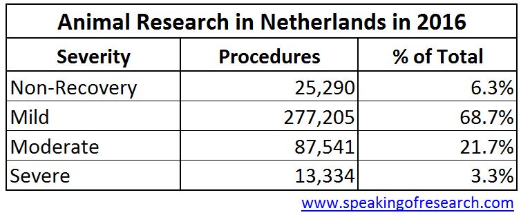 Mild or Non-Recovery (where the animal is anaesthetised and never woken up) accounted for 75.0% of procedures, Moderate accounted for 21.7%, and Severe procedures accounted for just 3.3%, a low proportion relative to most European countries (and down slightly from 3.6% in 2015). Most severe procedures were on mice (61% of severe procedures), but there was also a significant number of birds (19%) and rats (9%). There were no severe procedures on dogs, cats or primates in the Netherlands in 2016.