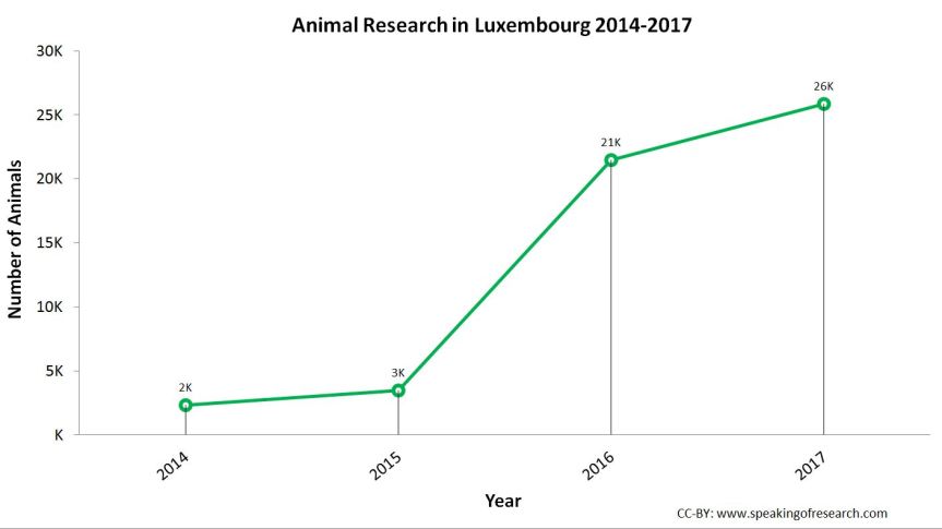Animal research has been on the rise in Luxembourg, with a huge jump between 2015 and 2016. It is too early to tell whether this rise will continue in future years.