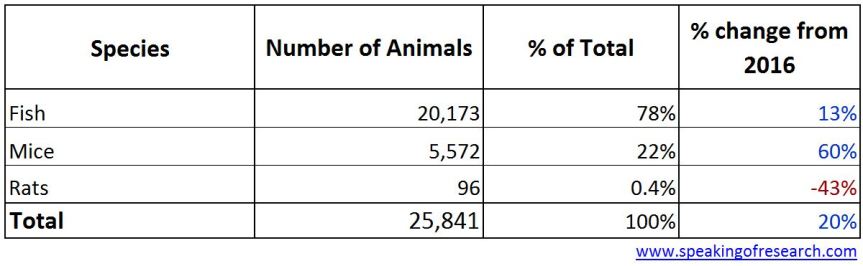 Only three species of animals were used: fish (78%), mice (22%) and rats (0.4%). Both mice and fish procedures rose by over 2,000 in 2017.