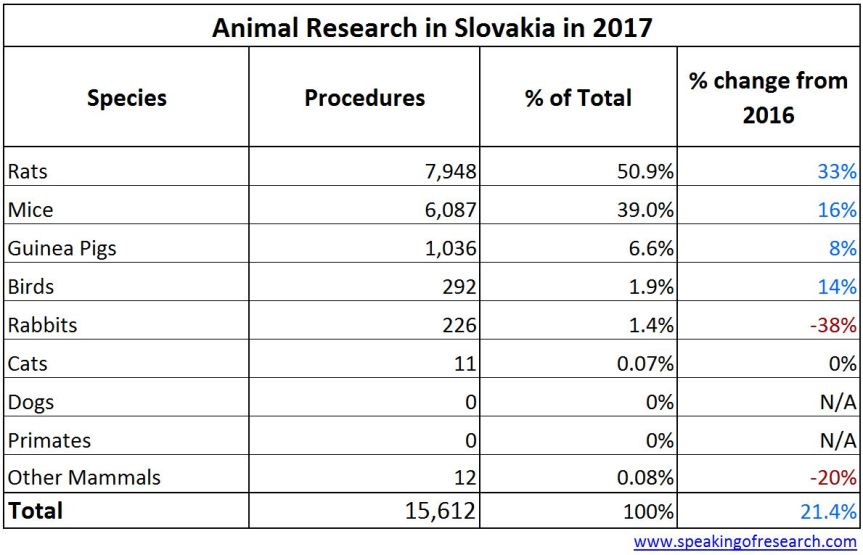 Slovakia was beaten by the Czech Republic to become the first EU country to report (permalink) its annual statistics in May. According to the State Veterinary and Food Administration (ŠVPS) there were 15,612 procedures on animals in Slovakia in 2017, a 21% rise from 2016.