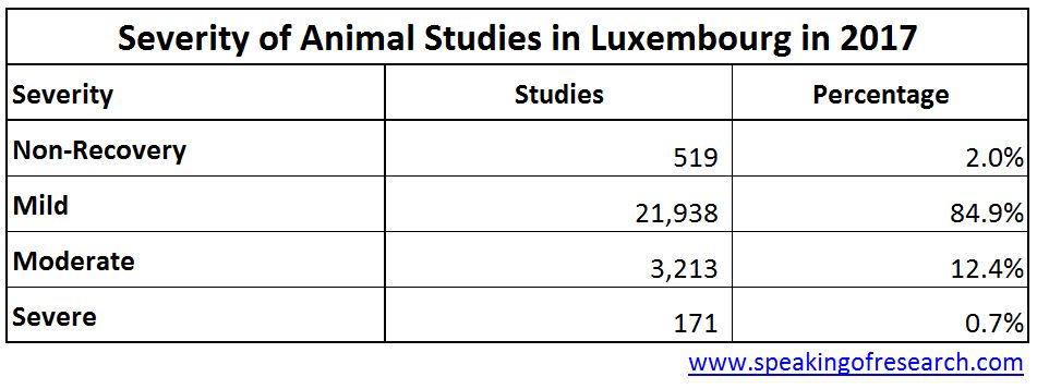 Luxembourg’s annual report on animal research (permalink) showed there were 25,841 animals used in research in 2017, up 20% from 2016.