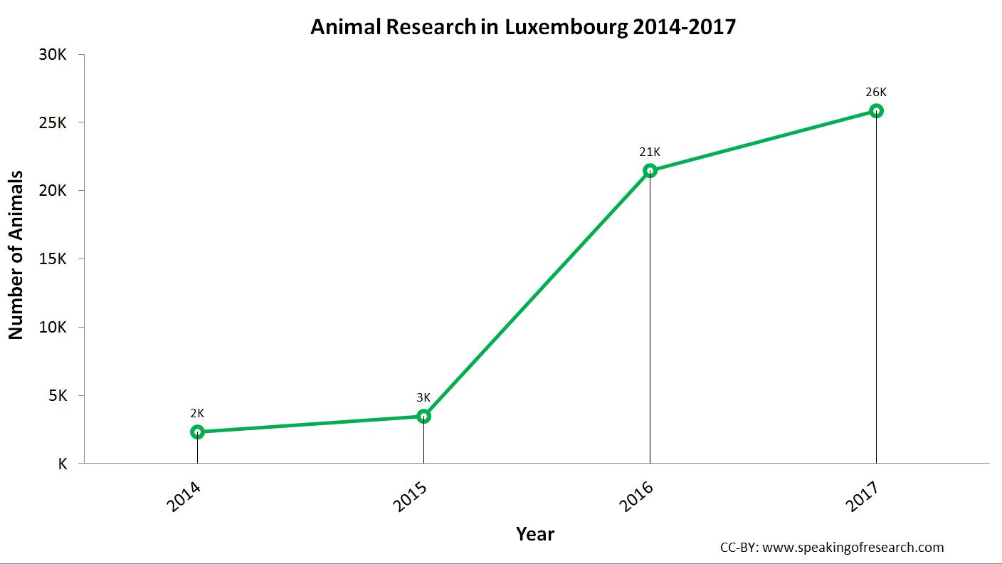 Animal research has been on the rise in Luxembourg, with a huge jump between 2015 and 2016. It is too early to tell whether this rise will continue in future years.
