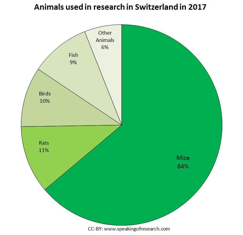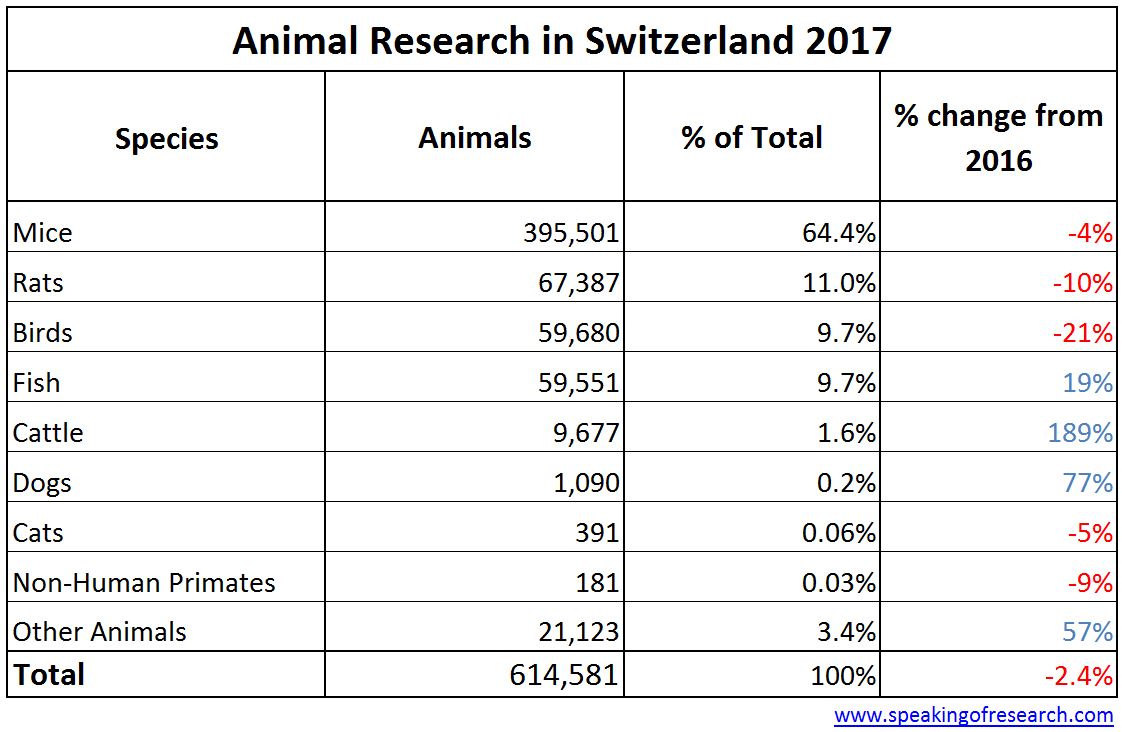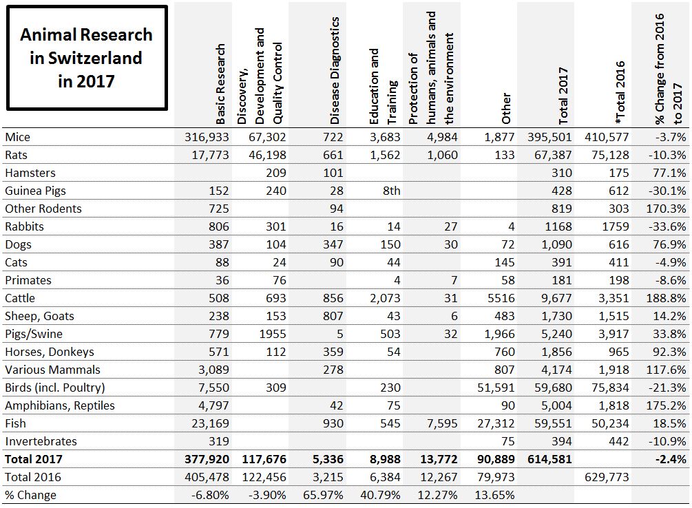 The statistics for animal research conducted in Switzerland in 2017 (permalink) were released yesterday. We have translated these tables into English and the data is summarized below. Overall the number of animals used in research in Switzerland was 614,581 in 2017, down 2.4% from the previous year.