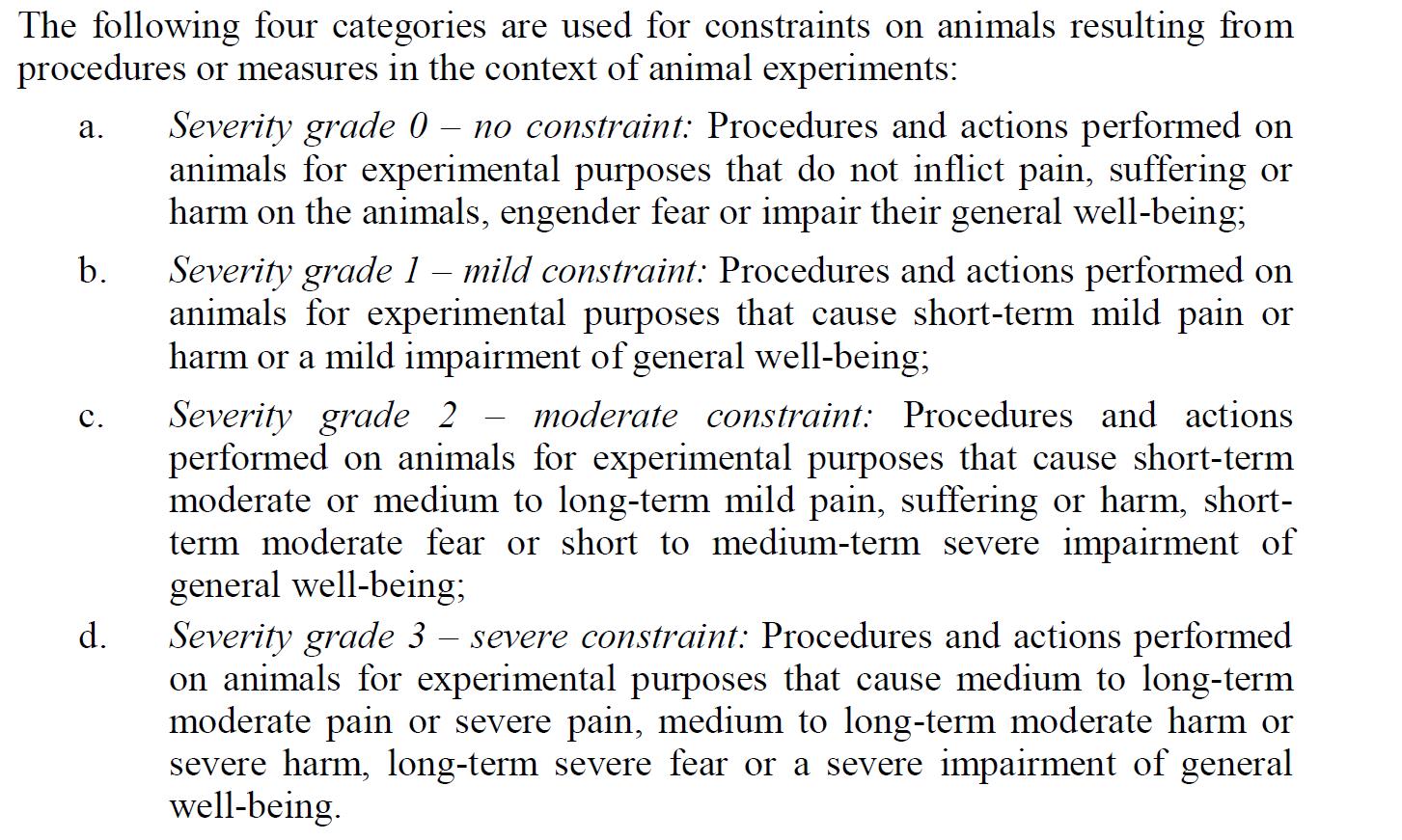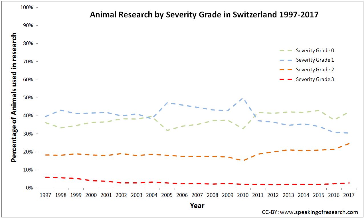 Pain, suffering and harm, were also measured and classified under four grades of severity; 0, 1, 2 and 3 (see translated definitions of severity). In 2017, 42.1% of experiments were Grade 0, 30.5% were Grade 1, 24.6% were Grade 2 and 2.8% were Grade 3. These numbers are relatively consistent across time, with on average 78% of all animals being exposed to no or minor short-lasting pain and distress.