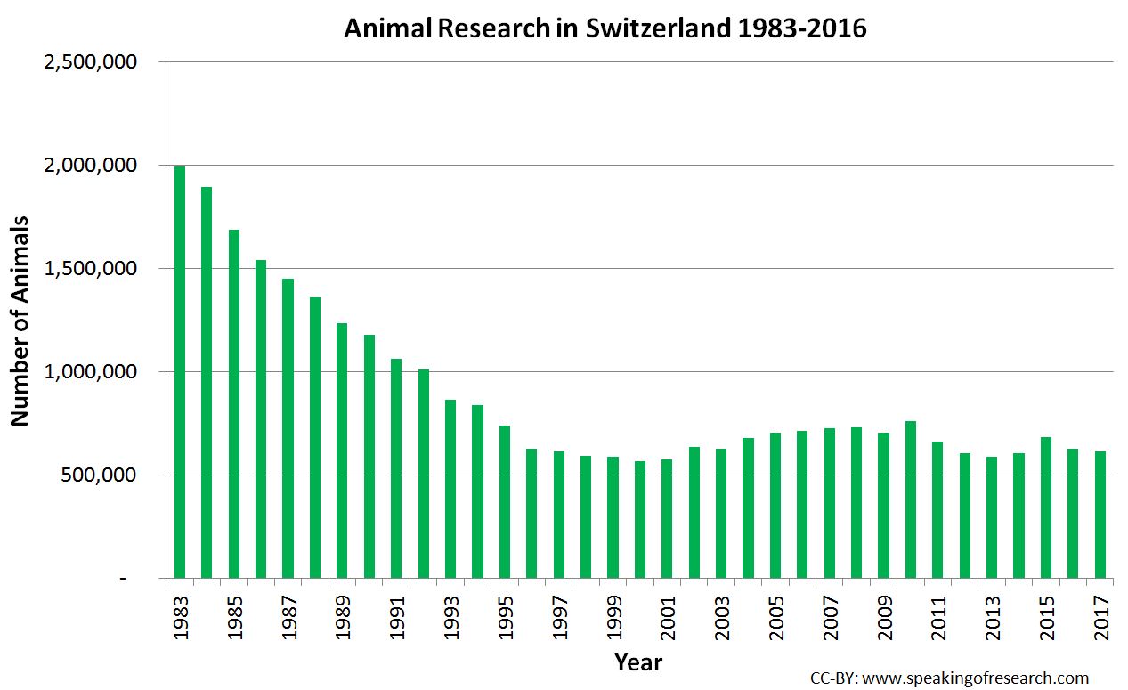 Overall there was a steady downward trend in the number of animals used in research in Switzerland from 1983 to 1995. Since 1995 the number of animal experiments has remained fairly consistent at around 650,000 animals.