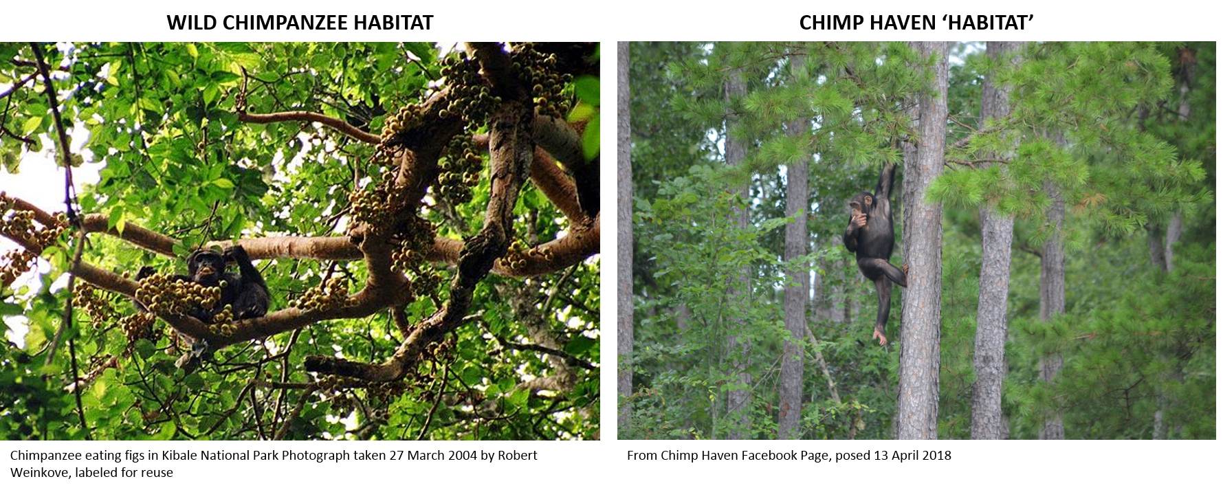Why would chimpanzees not use the forested area? Most likely it is because, although the Chimp Haven ‘habitats’ are forested – they are not the same habitat type as wild chimpanzee habitats/forests, as is shown in the comparison figure below. Notice the abundance of horizontal branches in real chimpanzee habitats compared to Chimp Haven ‘habitats’. Because only 13% of groups get to use the ‘habitats’ and that 13% only use them for 8% of the time, it is unreasonable to force the Bastrop chimps to relocate for such negligible benefit. Especially when there are chimps at other facilities that would definitely benefit from a move to the sanctuary. In a recent NPR story, staff from a facility in San Antonio, TX that houses NIH-supported chimpanzees said that their chimps could benefit from a move to Chimp Haven since some are currently living in small groups. Yet the NIH won’t send NIH-supported chimpanzees before NIH-owned chimpanzees, even if the NIH-supported chimps could benefit and the NIH-owned will not.