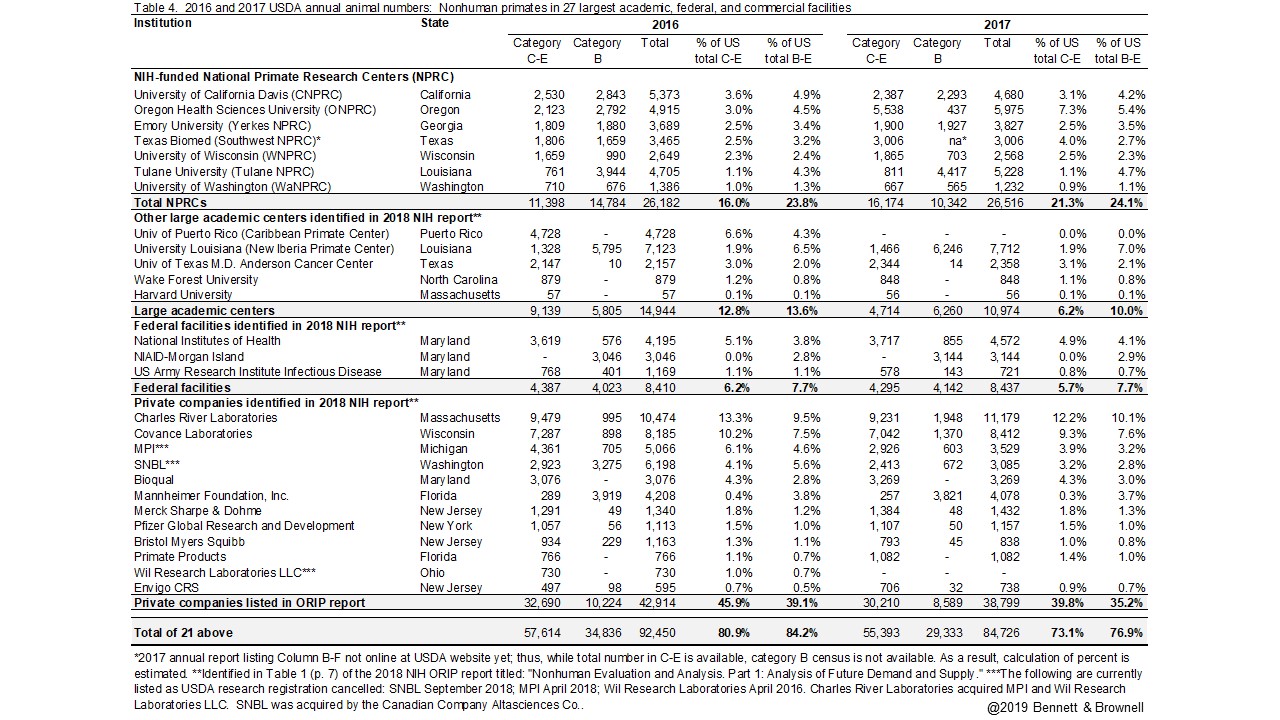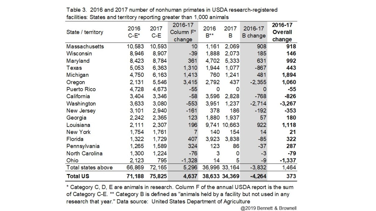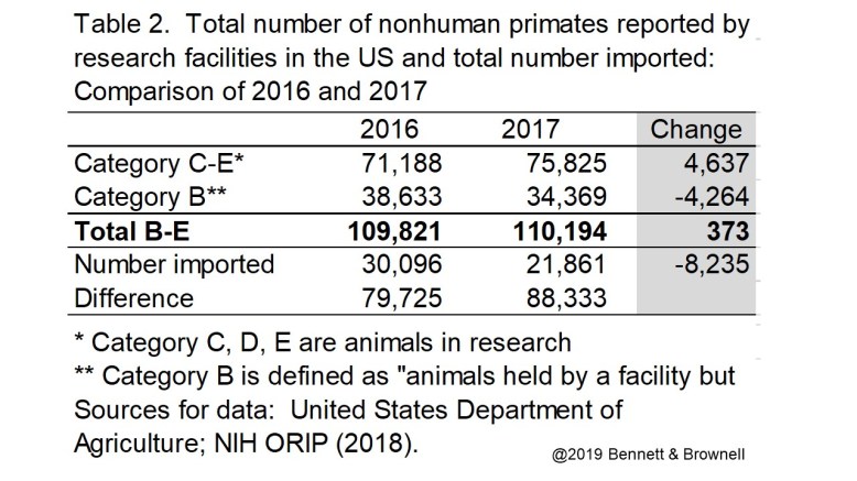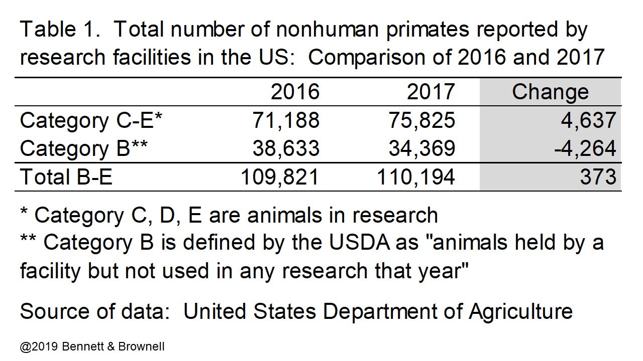 Table 1 shows that the total number of nonhuman primates in research categories in 2016 and 2017 were 71,188 and 75,825, respectively. The total numbers in Category B were 38,633 and 34,369, in 2016 and 2017 respectively. Thus, while there was an increase of 4,637 animals in research categories C-E, there was a drop of 4,264 in animals maintained in research facilities but not used in any research during the year. Considering both Category B and C-E together, there was a total increase of 373 animals from 2016 to 2017. (See here for full USDA reports: annual-report-animal-usage-by-fy2016 and annual-report-animal-usage-by-fy2017).