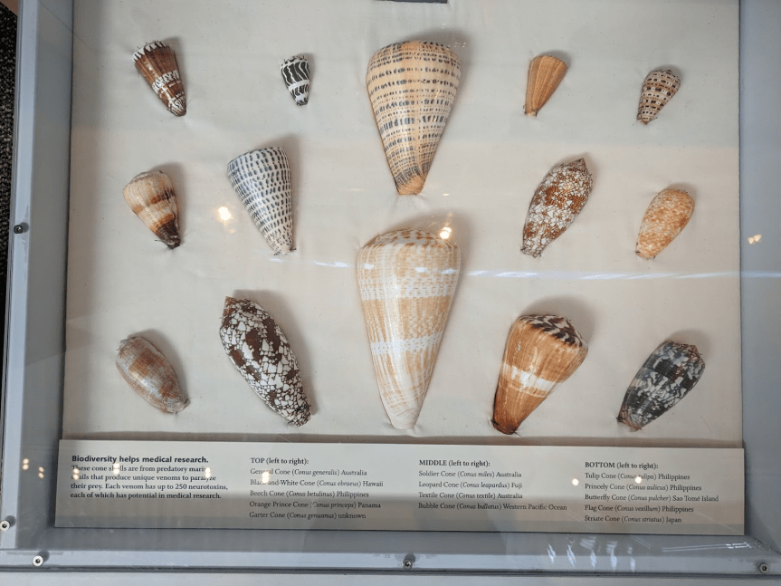 I recently visited the Natural History Museum at the University of Florida and found an odd animal that I didn’t know was used in medical research: Predatory Marine Snails, a.k.a. Cone snails. The museum had a drawer of these snails (see below) and noted that they are used in medical research because the snails use unique venoms to paralyze their prey. The unique venoms have up to 250 neurotoxins, each of which has potential in medical research. How cool! Side-note/Nerd-Flex: I visited quite a few Natural History Museums these past few months–Cleveland, San Diego, Zurich–they’re a great resource for learning about the types of animals living near the area–I mostly go to be a better bird spotter while I’m around town.
