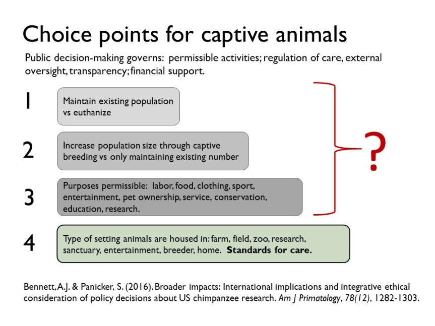 Animal care, housing, psychological well-being and treatment are all relevant and core ethical considerations in weighing the use of animals in research. They are relevant to assessing potential harm in balance with scientific objectives and potential benefit. But they are also a set of questions that arise if, and only if, the decision is made to house animals in captive settings. We have previously proposed a framework for broad consideration of housing animals in captivity (see below). The framework identifies four major choice points for decision making, starting with basic questions about whether captive populations of animals should be maintained at all, or increased at all. The subsequent questions—what purposes are permissible, and standards of housing and care, are premised on ethical consideration of human use of other animals within captive settings.