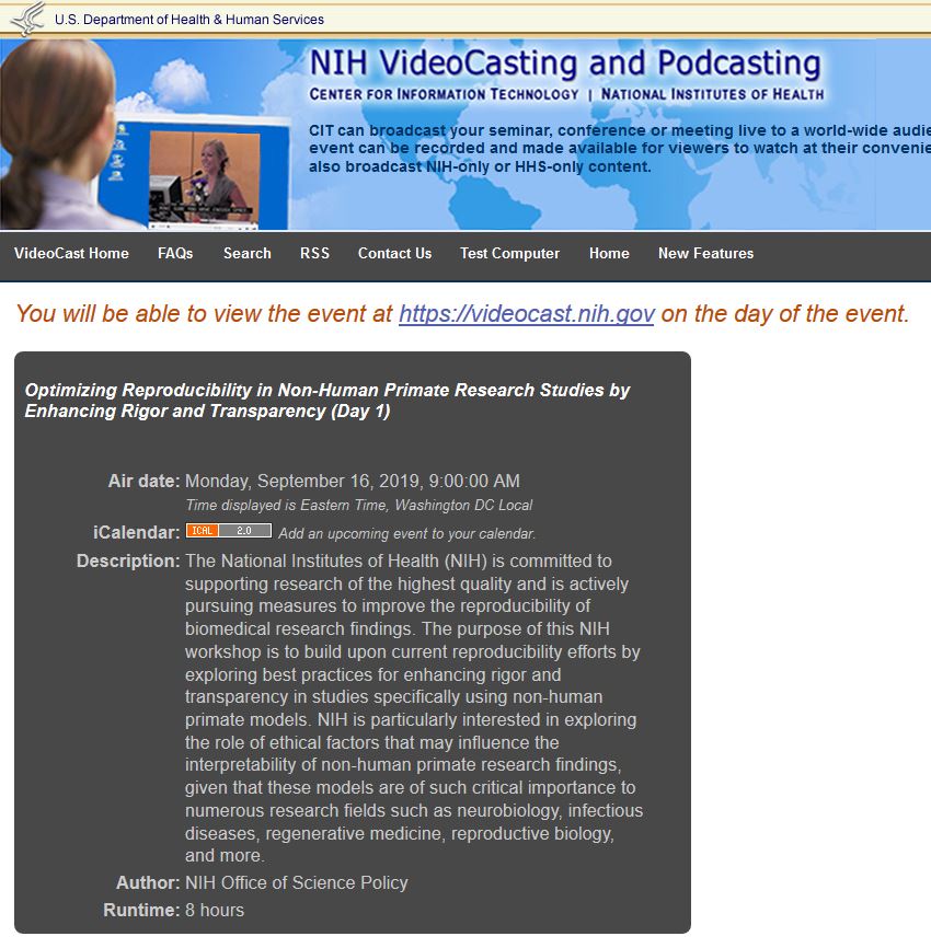 The NIH Office of Science Policy page contains the following notice: “Please note that the “NIH Workshop on Optimizing Reproducibility in Non-Human Primate Research Studies by Enhancing Rigor and Transparency” originally scheduled for Sept 16-17, has been postponed and will be rescheduled.“
