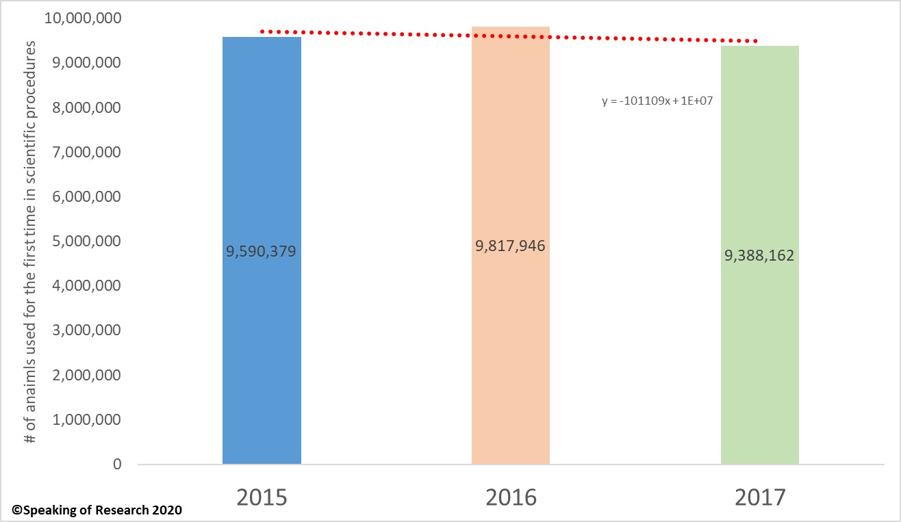Thirdly, even if we were to assume that the most recent data are correct (2015-2017), one can hardly conclude that the number of animals used are decreasing. The number of animals used for the first time in scientific procedures increased by 2% from 2015 to 2016 and then decreased from 2016 to 2017 by 5%.