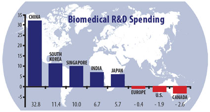 Perhaps in 2018 we will see another increase, similar to what was observed between 2015-2016? More importantly, however, and as we have stated before, simply reporting the numbers ignores the global context and relevant information about changes in animals used in research over time. One such context is that animal research may be continuing, but elsewhere. This would be unsurprising, given that that investment into biomedical research by other countries such as China, far outpaces that of Europe, America and Canada.
