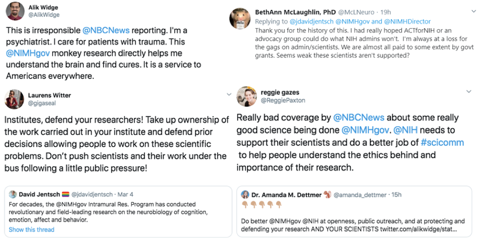 Thank you for writing this important article. It is essential that NIH and other scientific organizations defend the need for certain experiments with animals, including the experiments referenced here.