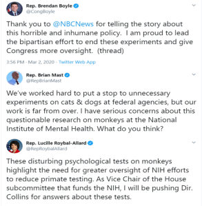 “Asked about the lawmakers’ criticisms, the NIH defended primate testing, saying it has helped scientists understand how the brain copes with conditions like post-traumatic stress disorder, schizophrenia and obsessive-compulsive disorder.