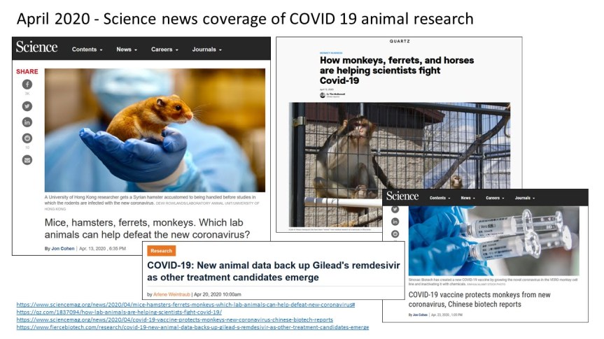Other animal species, such as mice, monkeys, cats, dogs, ferrets, chickens, and even horses are also being used in our fight against COVID-19 to address pertinent questions such as: