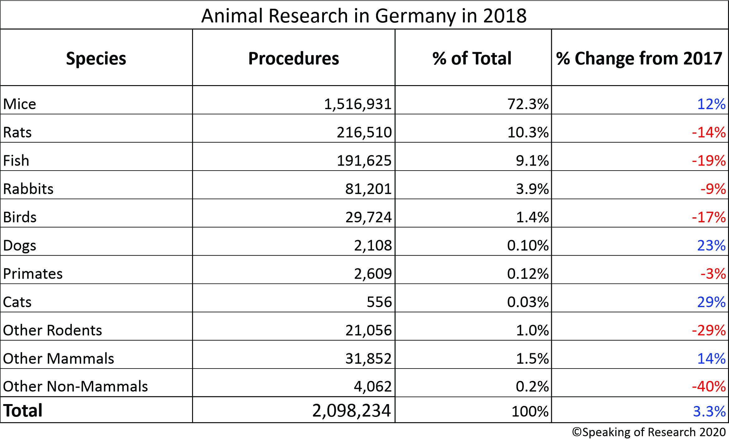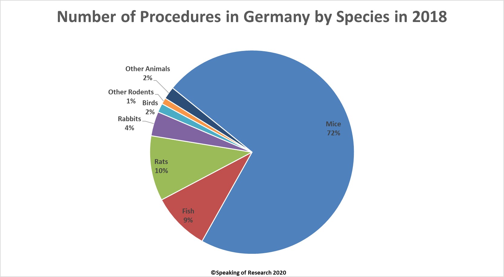 Rodents (mainly mice and rats), fish, birds and rabbits account for 98% of the animals used in research, with mice being by far the most common species (72% of total procedures). Dogs, cats and primates together accounted for less than 0.34% of all animals used.