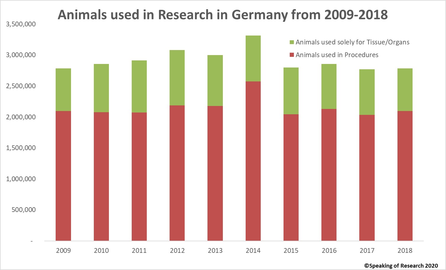 Germany’s statistical releases also include a second set of data which includes animals killed solely for tissues or organs (under §4(3) of the Animal Protection Act). Since the animals undergo no experimental procedure, they are not included in the above statistics. Prior to EU Directive 2010/63, Germany counted only numbers of animals, including those killed for tissues and organs (without other procedures); this data is still collected but is not broken down in the detail provided by the newer procedure-oriented statistics. We can see both data below.