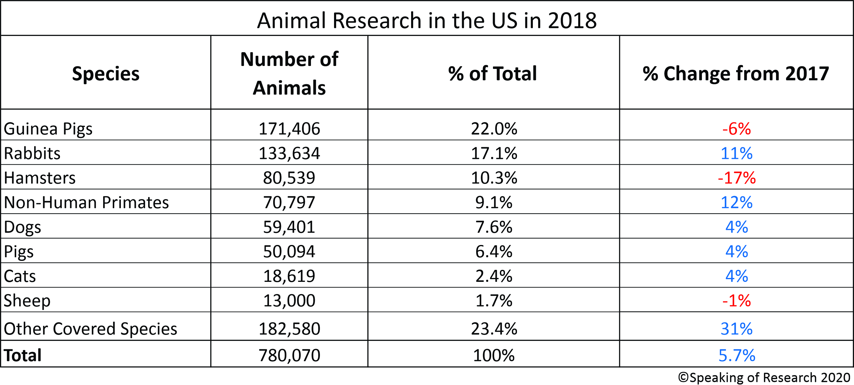 In 2018, US government statistics put the number of laboratory animals used in research at 780,070, an increase of 5.7% from 2017. This includes both public and private institutions. These statistics do not include all animals as most mice, rats, and fish are not covered by the Animal Welfare Act – though they are still covered by other regulations that protect animal welfare. We also have not included the 122,717 animals which were kept in research facilities in 2018 but were not involved in any research studies.