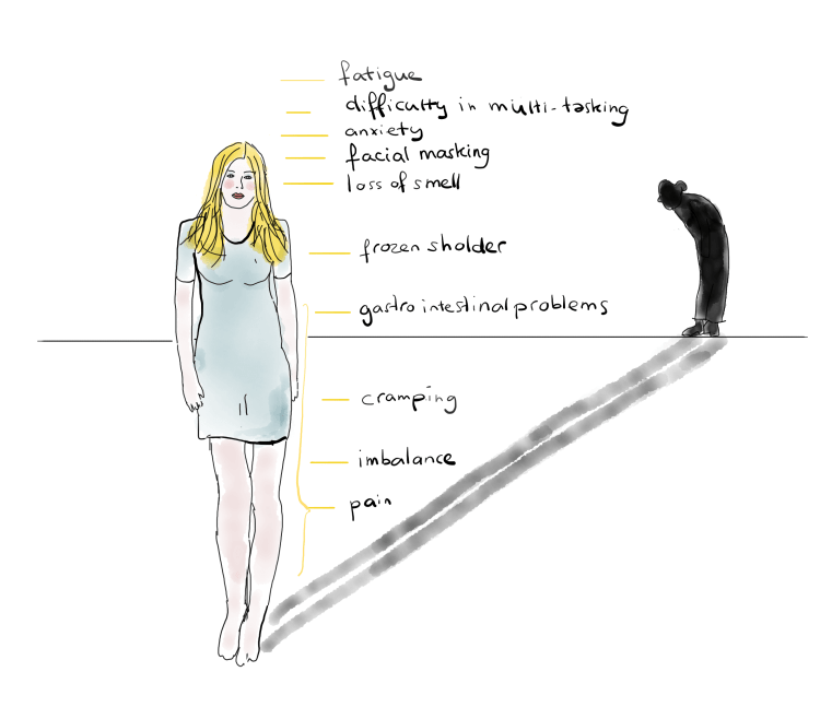 Typical signs and symptoms of PD include motor disturbances like bradykinesia (slowness of movement), rigidity, postural instability and, in a majority of patients, the characteristic pill rolling tremor. The characteristic underlying pathology of PD motor symptoms is the death of dopamine-generating cells in the substantia nigra, a part of the brain involved in movement, reward and addiction. Non-motor symptoms like constipation, mood and sleep problems often occur before the motor symptoms, and cognitive decline and lower quality of life are common at later stages. Like other common diseases, PD is thought to arise from complex interactions between genetic and environmental factors, which remain mostly unknown.