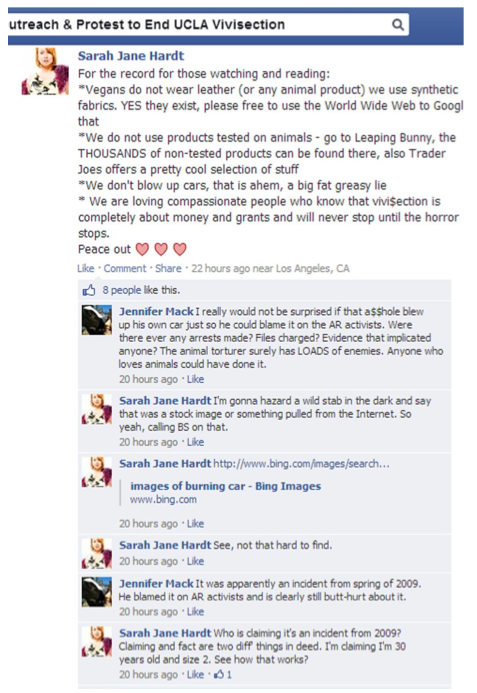 Funny… Topping all this, Ms. Hardt and her friends also had the ethical chutzpah to suggest that UCLA Professor David Jentsch, against who they demonstrate, had firebombed his own car, instead of accepting the claim of responsibility made openly by the Animal Liberation Brigade.