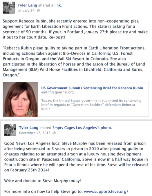 Not only do they refuse to condemn those that firebomb cars or homes, but they publicly offer support to convicted animal rights arsonists. Here is Tyler Lang, another member of the group, offering support for two of them: