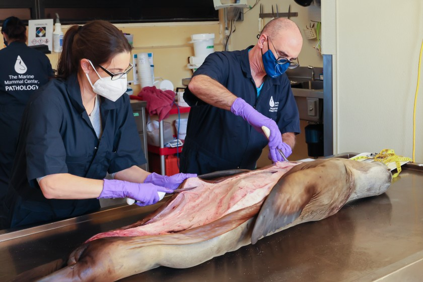 The Marine Mammal Center’s chief pathologist Pádraig Duignan, right, and fellow Maggie Martinez perform a necropsy on a California sea lion that was euthanized due to untreatable cancer (Bill Hunnewell / Marine Mammal Center).