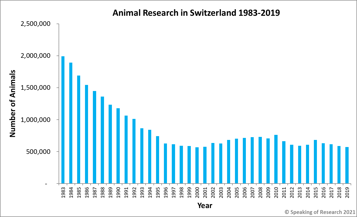 There was a steady downward trend in the number of animals used in research in Switzerland from 1983-1995, with numbers remaining reasonably constant thereafter.