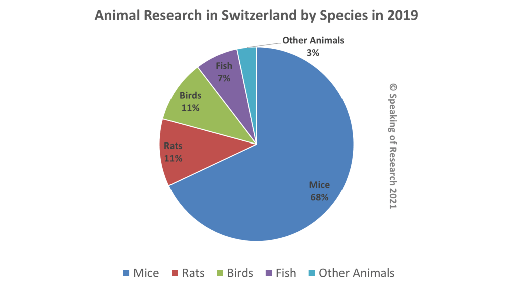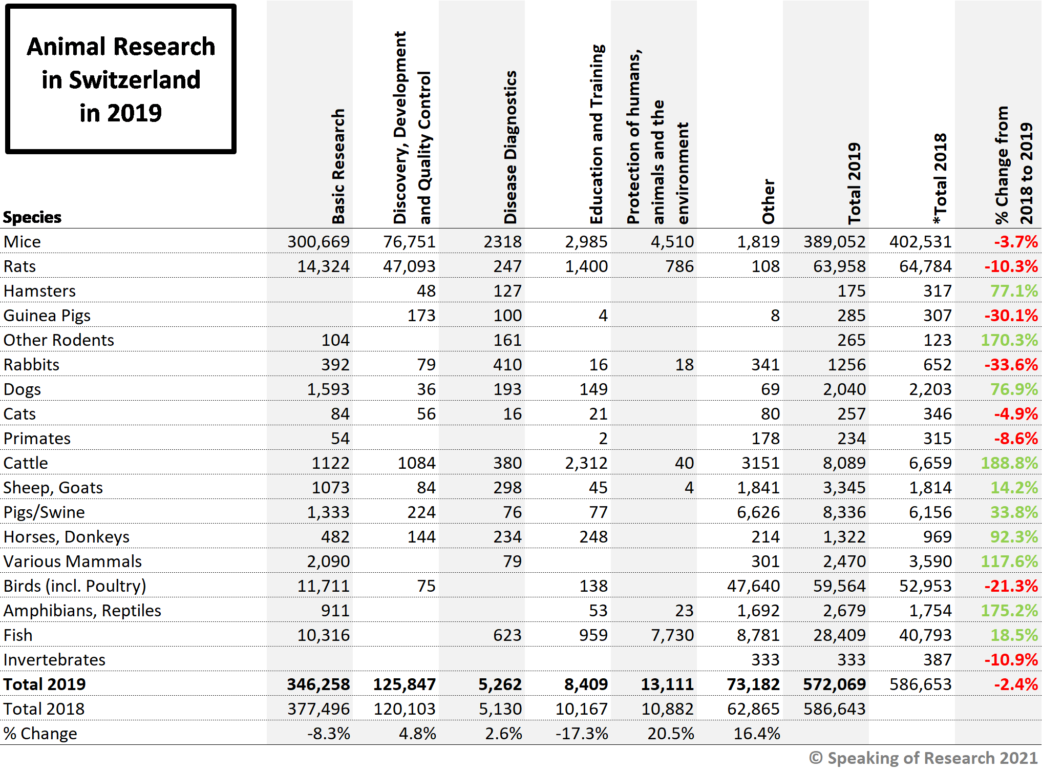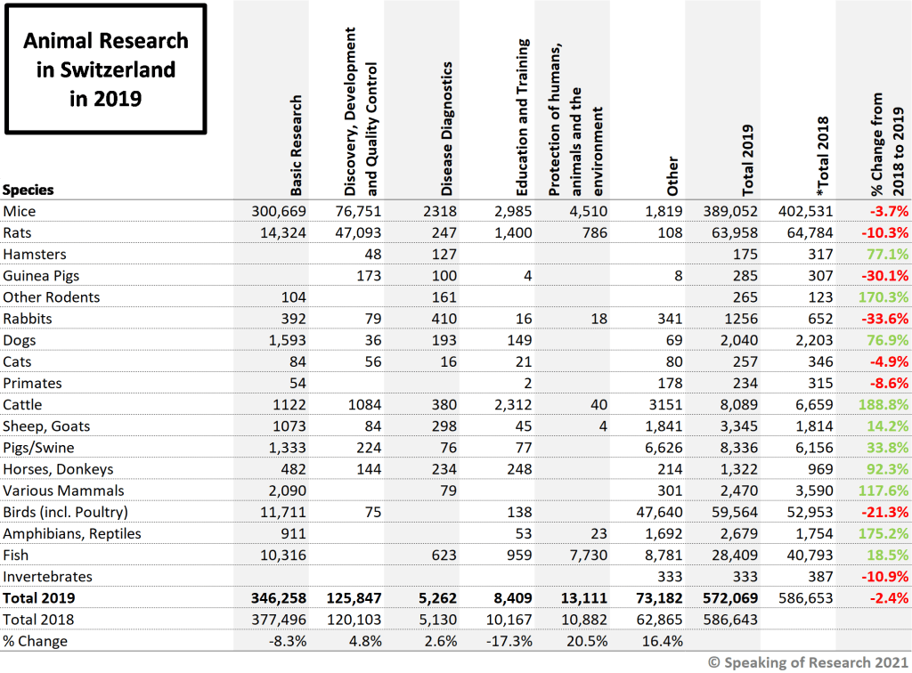 We have translated the statistics for animal research conducted in Switzerland in 2019 and these data are summarized below. Overall, there were 572,069 animals used in research and animal testing in Switzerland in 2019 — a 2.4% decrease compared to 2018.