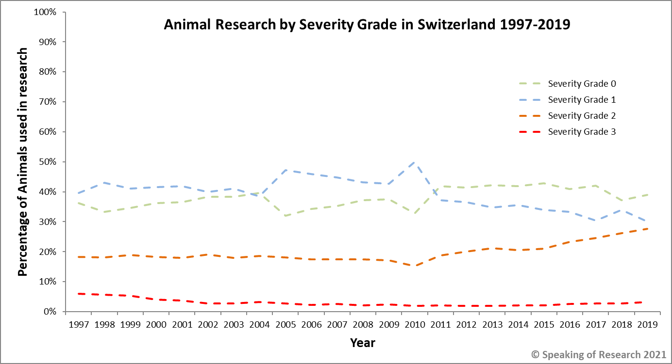 Pain, suffering and harm, were also measured and classified under four grades of severity; 0, 1, 2 and 3. In 2019, 39% of experiments were Grade 0, 30% were Grade 1, 28% were Grade 2 and 3% were Grade 3. These numbers are relatively consistent across time, with on average 77% of all animals being exposed to no or minor short-lasting pain and distress.