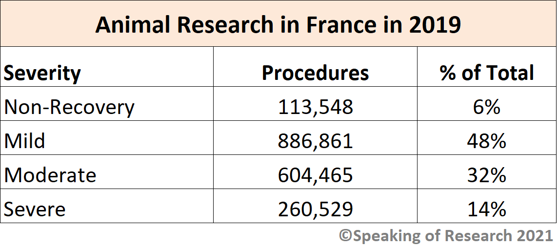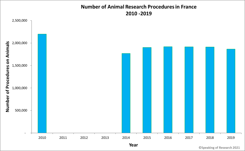 Until 2013, France released their animal research statistics on a triennial basis. Since 2014 and the implementation of EU Directive 2010/43, the French Ministry of Higher education, Research and Innovation began publishing animal use statistics on an annual basis. According to the 2019 figures, France conducted 1,865,403 procedures on animals in 2019, a 2.4% decrease compared to 2018.