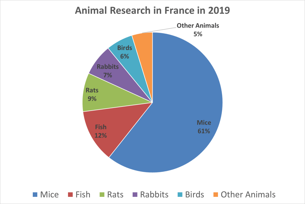 There were decreases in the use of mice (-5%) and fish (-11%) and increases in rats (+4%), rabbits (+3%) and birds (+53%). Mice, fish, rats, rabbits and birds accounted for 95% of all animal use in France in 2019. Dogs, cats and primates, which receive particular media and public attention accounted for a mere 0.55% of all animal use.