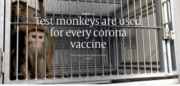 The journalist Maartje, as part of Dutch news source De Volksrand, was given full access to the testing of a Covid-19 vaccine in monkeys at the Biomedical Primate Research Center (BPRC) in Rijswijk, the Netherlands, during the 2020 Covid-19 pandemic. The journalist interviewed the animal caretakers, researchers and ethicists involved, and followed two monkeys named Chips and Dip throughout the vaccine testing including the completion of the research with their euthanasia.