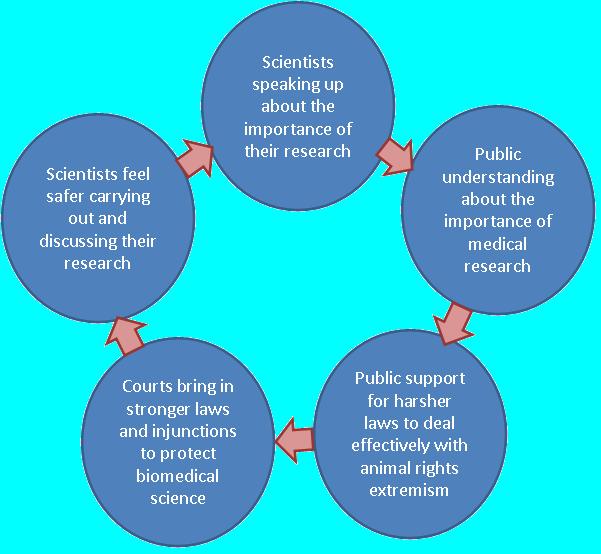 If we look at the diagram below we see how animal rights extremism can, and must, be tackled from many angles. Speaking of Research aims to help this process by encouraging scientists to speak up about their work and try to inform public opinion by providing them with the straight facts about research.