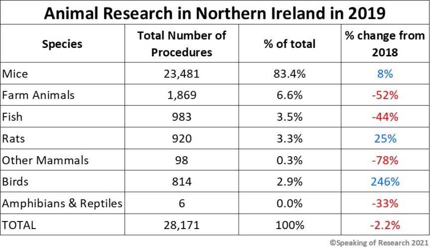 Animal research in Northern Ireland accounts for 0.01% of the total animal research in the UK. In 2018 the number of procedures was 28,171, and increase of 2.2% from 2018.