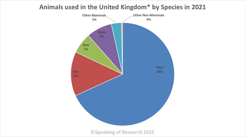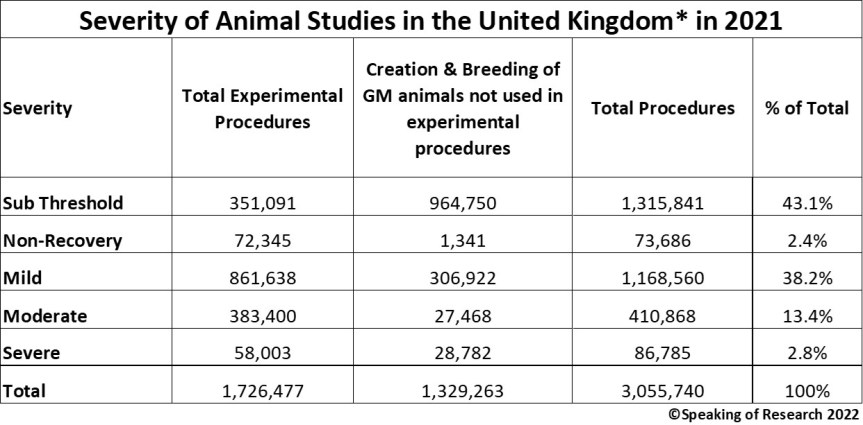 The United Kingdom reports a wealth of information every year on its use of animals in research. Every animal procedure must be categorized according to the overall purpose (and specific disease area or regulatory purpose if relevant), the genetic status of the animals and the severity of the procedure. Historically, Great Britain (England, Scotland and Wales) conducts approximately 99.5% of procedures, which are regulated by and reported by the UK Home Office. Northern Ireland has not yet released animal use statistics for 2021.