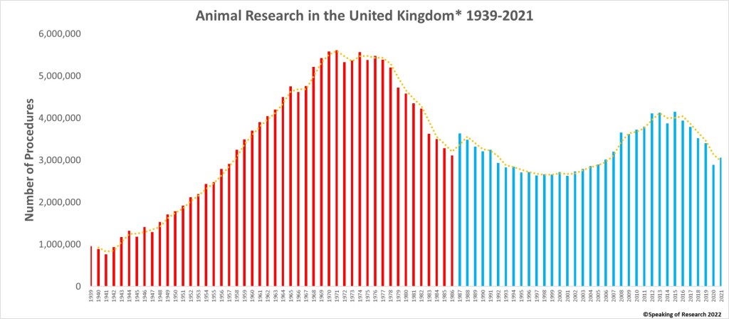 The total number of animals used is quite likely lower as some animals were used for more than one procedure*. In 1987 the UK changed the way in which it counted animals, from the total number of animals to the total number of procedures. There was a further, smaller change to methodologies in 2014.