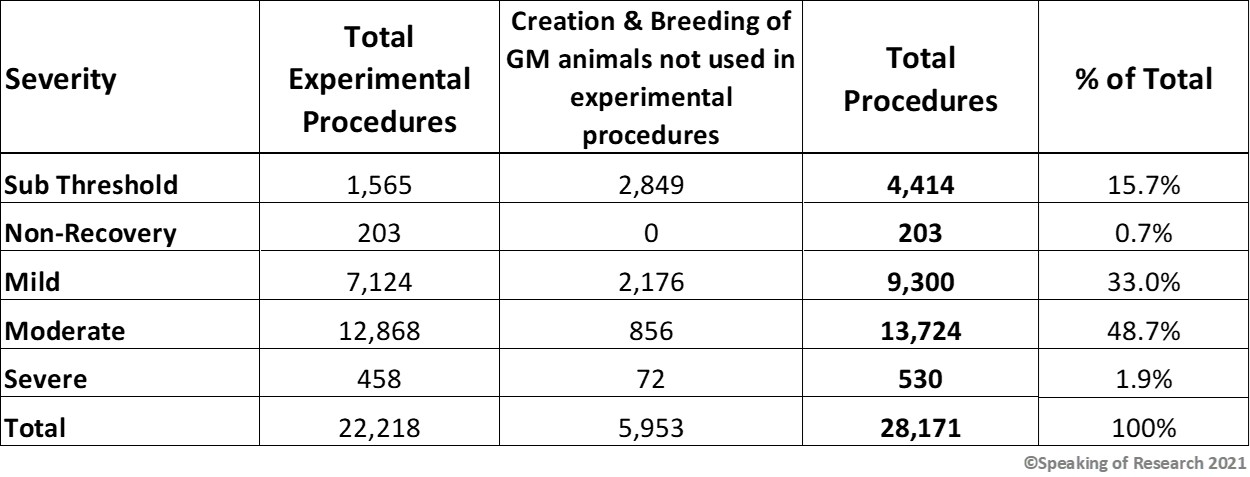 The UK statistics include retrospective reporting of suffering. Rather than just submitting license proposals to the Home Office that include estimated levels of suffering, the researchers now have to report on what was actually seen (using a variety of measures). Unfortunately, the statistics put these in two separate tables (Table 3.1 and 8). We have combined them to get severity for all procedures in 2021 – see definitions on page 23 or click here). It shows that 83.7% of procedures are sub-threshold, non-recovery or mild, and involved minimal pain or suffering for the animals. 13% of studies were moderate and 3% were severe.